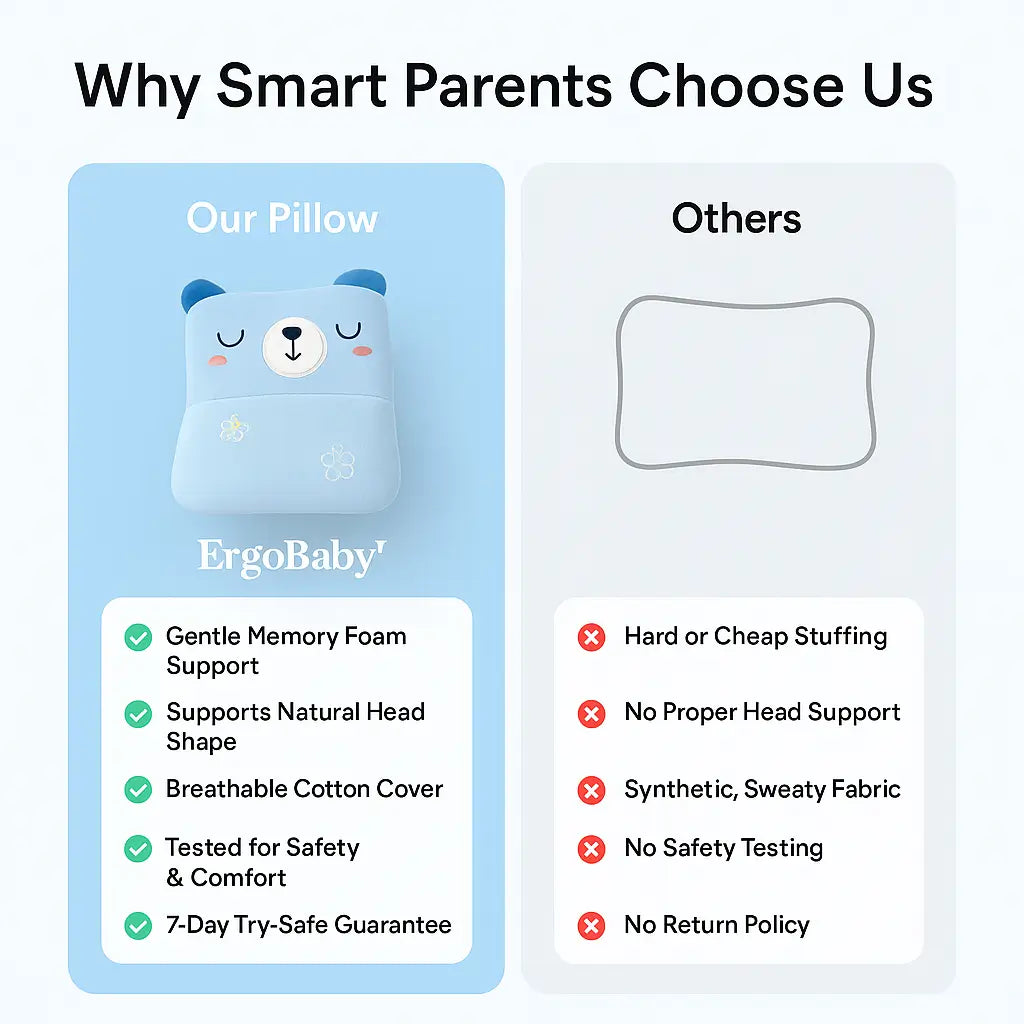 Unlike traditional baby pillows, this pillow features contoured edges that provide complete support to both the neck and skull — ensuring alignment, comfort, and posture during naps and night sleep.